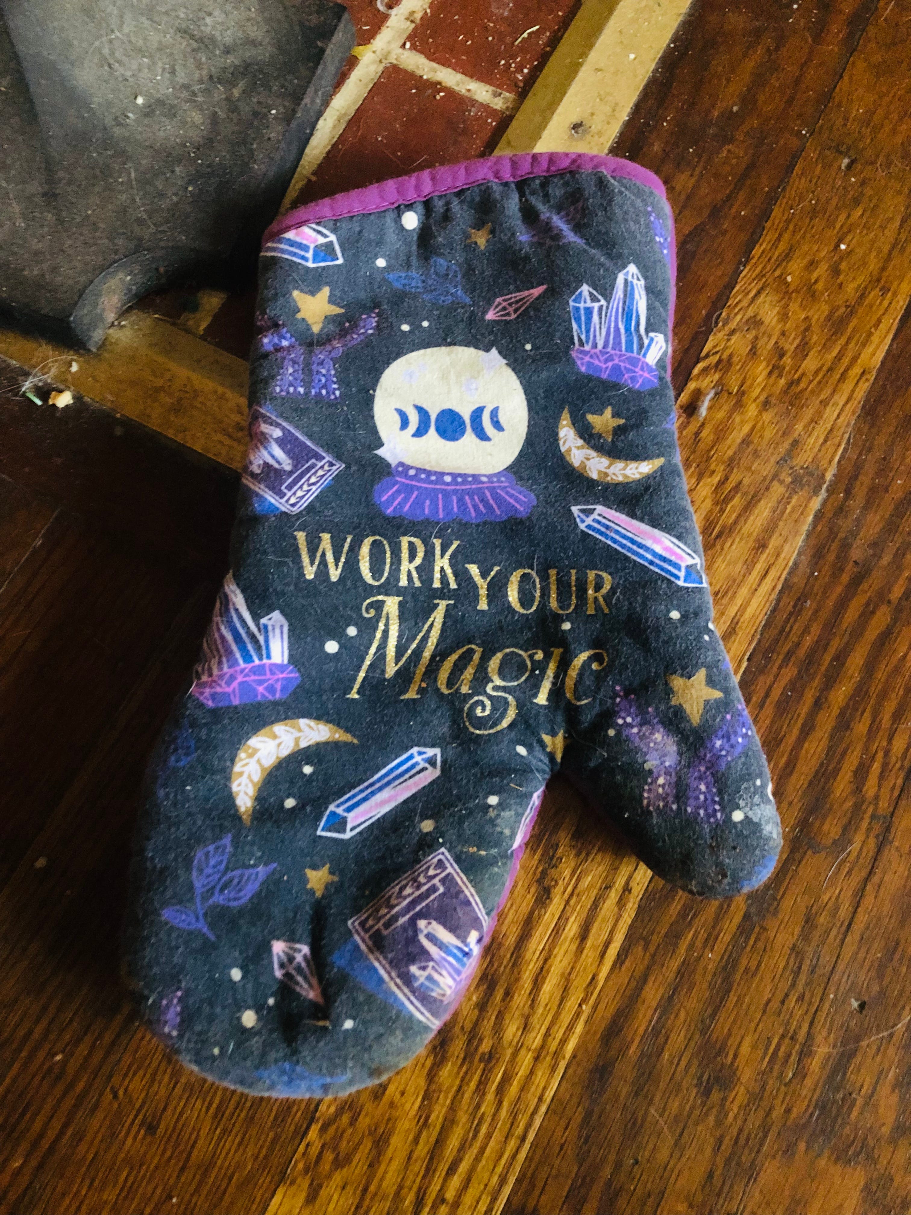 My family has a tendency to walk through the house and in the wake of their boisterous energy, things just kind of fly up in the air and fall on the ground behind them! Because they are all so eager to get where they are going they fail to notice this phenomenon occurring at the time and therefore, feel no responsibility to pick anything up off the floor. This results in random items being strewn about my floors at all hours of the day and my daily sweep often collects the oddest items. One such item this morning was a Halloween oven mitt with the words, “Work your magic,” written across it.